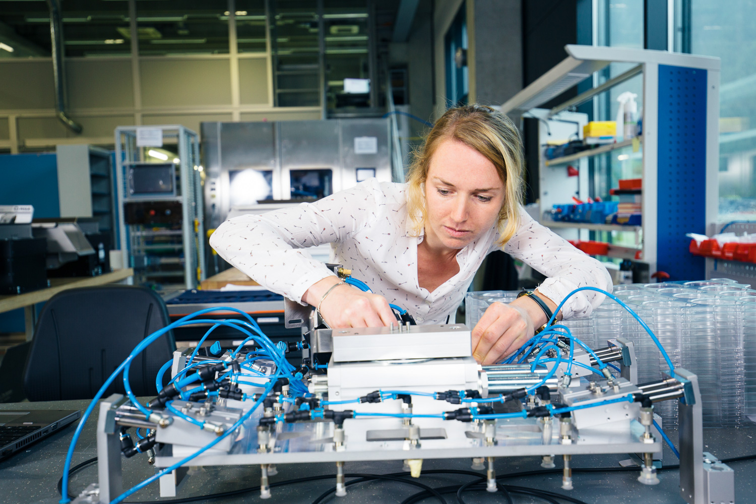 In der Montagehalle, die gleich unter dem Grossraumbüro liegt, in dem die Ingenieurinnen und Ingenieure und die Administration der Gritec sitzen, liegen schon verschiedene Einzelteile von Brütschs Automatisationsanlage bereit. Sie nimmt einen Greifarm in die Hand, prüft die Verarbeitung und legt ihn dann zufrieden zurück. Es scheint, als ob ihre Pläne stimmen.